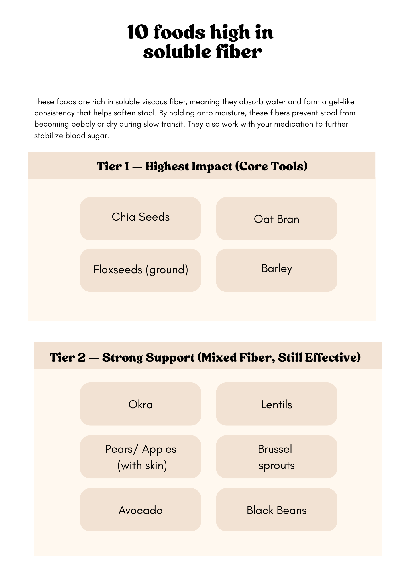 The Benefit: By holding onto moisture, these fibers prevent stool from becoming “pebbly” or dry during slow transit. They also work in tandem with your medication to further stabilize blood sugar.